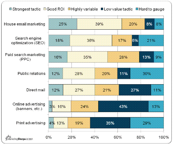 ¿Alguna vez te has preguntado cuáles son las tácticas de marketing más rentables? El reciente informe Search Marketing Benchmark Guide 2007-2008 de MarketingSherpa incluye una interesante comparativa de tácticas de marketing en mercados B2B desde el punto de su ROI. No se trata de una comparativa basada en eficacia sino en rentabilidad y, como tal, tiene en cuenta tanto la inversión necesaria como los resultados obtenidos.
