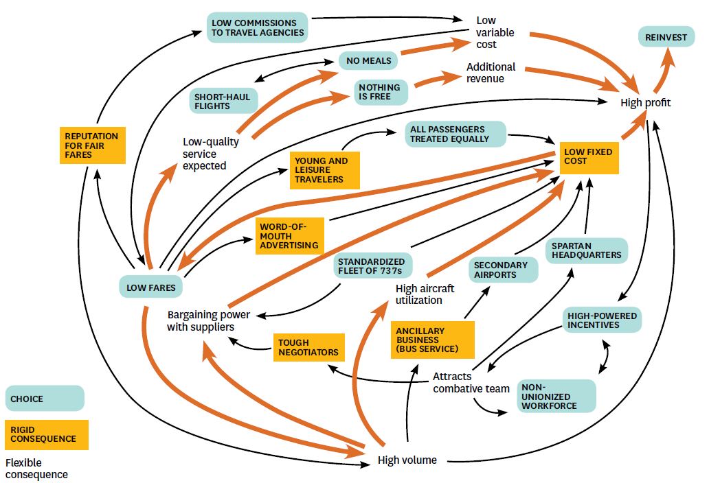 Este concepto de modelo de negocio se representa naturalmente de una forma más dinámica mediante diagramas de flujo causales, en lugar de con planos o “lienzos” más o menos estáticos. Como ejemplo de diagrama de flujo causal, la siguiente figura representa el modelo de negocio de la aerolínea de bajo coste Ryanair, tomada de “How to Design a Winning Business Model”, de los propios Ricart y Casadesus-Masanell.