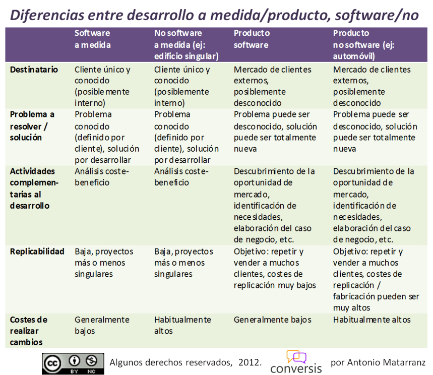 Por resumir, las diferencias entre un desarrollo a medida y uno de producto es que el primero es un desarrollo más o menos singular, definido para resolver el problema de un cliente dado. Por el contrario el desarrollo de producto va dirigido a resolver las necesidadesa veces latentes– de un mercado de clientes en general desconocidos (individual y, muchas veces, colectivamente). Además, lo que se conoce como Desarrollo de Nuevos Productos (NPD, New Product Development) abarca varias fases previas a (o concurrentes con) su “construcción”, que incluyen el descubrimiento de la oportunidad, la comprensión del mercado, la identificación de necesidades, la validación del modelo de negocio o la elaboración del caso de negocio. Finalmente, la vida de un producto abarca esas fases previas y otras posteriores como su lanzamiento, comercialización, evolución o retirada del mercado (generalmente a través de una sustitución ordenada mediante nuevos productos de la empresa)… lo que tradicionalmente constituye el área de Product Management y Product Marketing.