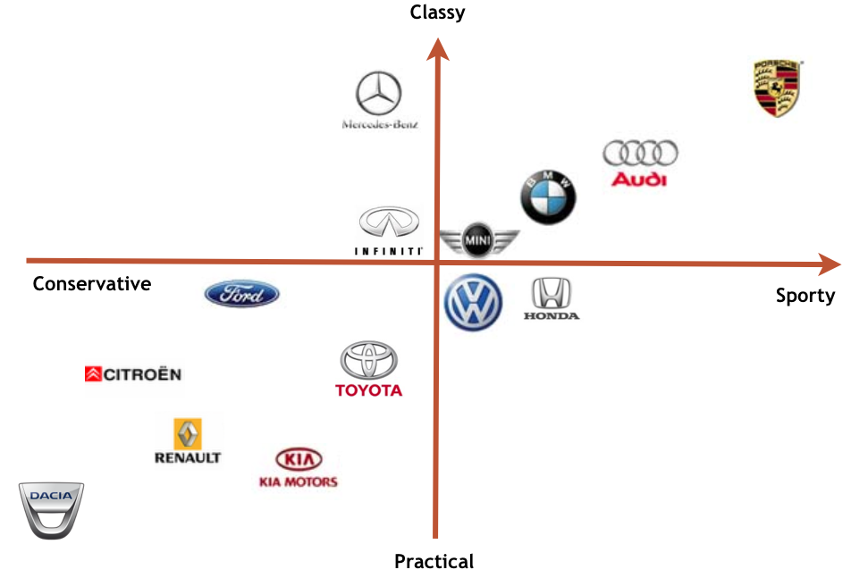 La figura presenta el mapa de percepción de marcas de automóviles en función de los atributos clásico-deportivo y elegante-práctico.