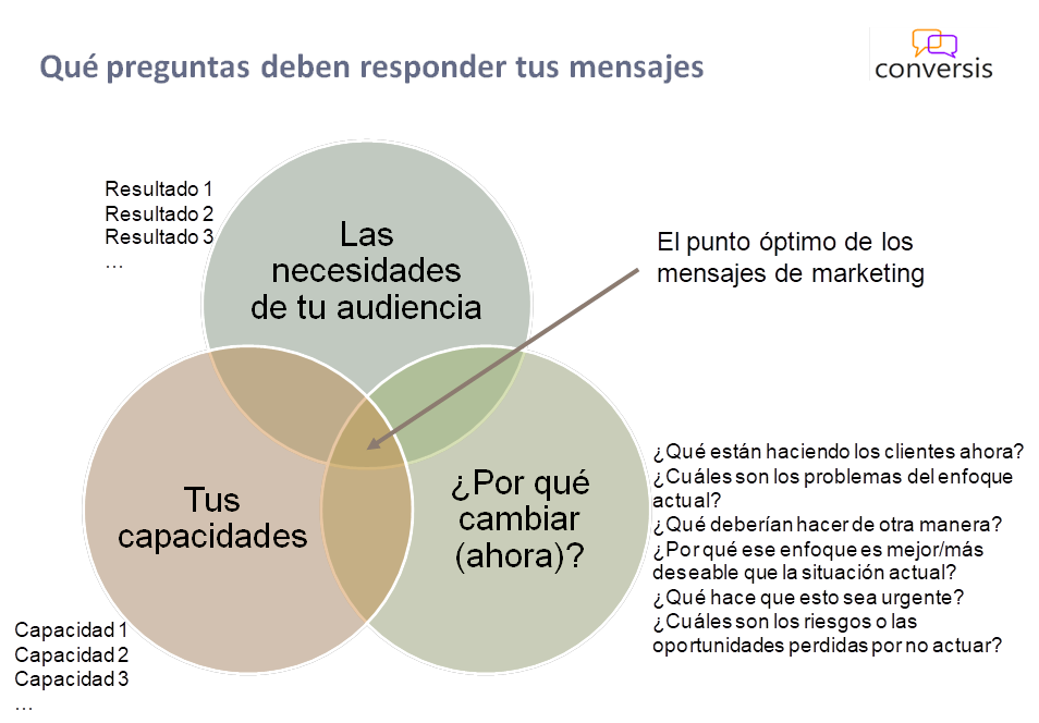 Por eso los mensajes eficaces son aquellos que encuentran la intersección entre lo que ofrece la empresa, los problemas que diferentes tipos de clientes tienen que resolver y las razones por las que deberían cambiar lo que hacen ahora. Tenemos que enfocar nuestros mensajes en lo que los clientes quieren, por qué con los enfoques actuales no lo van a conseguir y por qué nuestra solución representa un mejor enfoque que no pueden dejar de lado, diferenciándola de los competidores y resaltando las razones para cambiar que aporta.